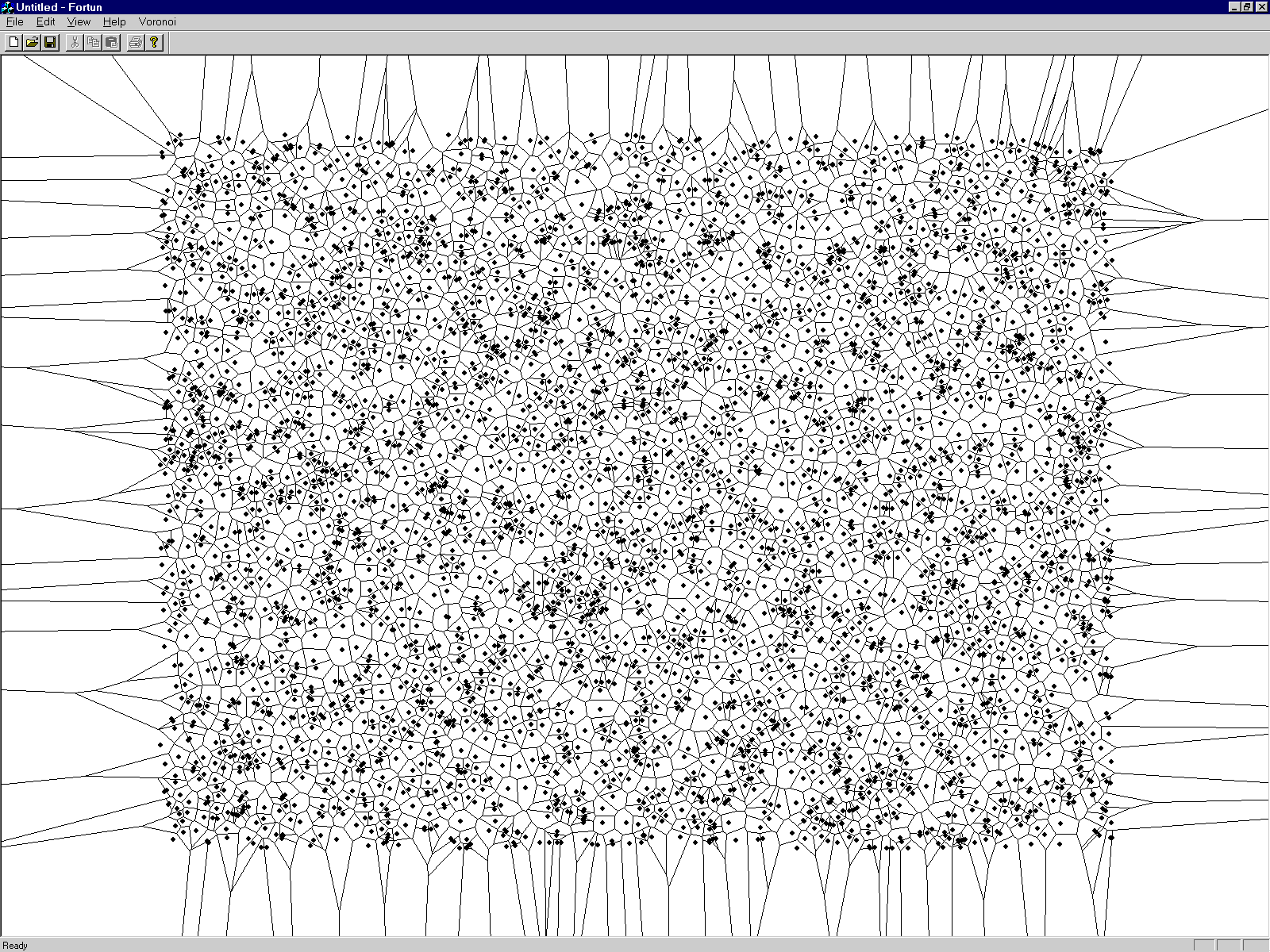 It is known from literature, the Fortune's algorithm works in O(n log2 n) time and that it is one of the simplest algorithms for constructing the Voronoi diagrams. Table 1 shows the obtained measurements of spent CPU time for different number of points. It can be concluded that the theoretical time complexity estimation is achieved also in practice. The algorithm is implemented in C++ and the measurements have been done on PC Pentium 133 MHz and 64 Mbytes RAM. The results of construction can be seen in Figure 11.