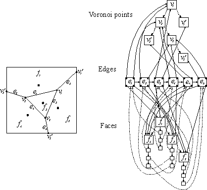 Data structure for storing Voronoi diagram is combined from three data structures. Voronoi diagram consists of Voronoi cells (faces), Voronoi edges and Voronoi points [BERG97]. Each group of these elements is stored in its own data structure that are, of course, connected among them. Figure 7 is shown the graphical representation of the Voronoi diagram.